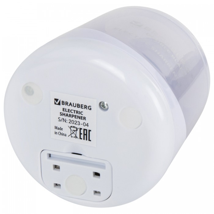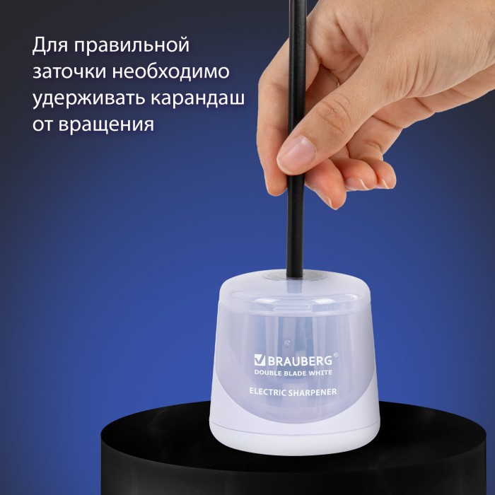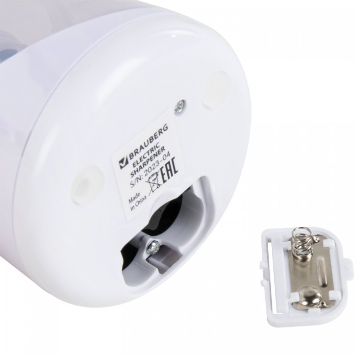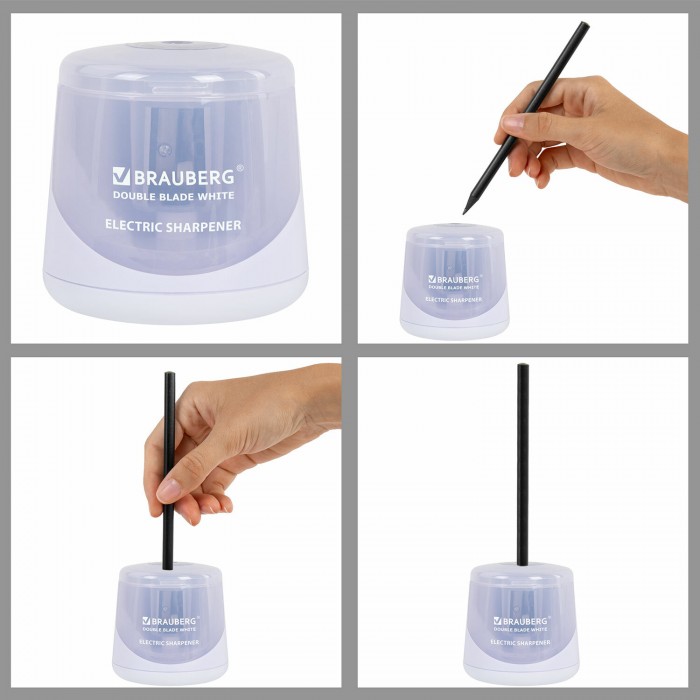 Электрическая точилка BRAUBERG DOUBLE BLADE WHITE с контейнером для сбора стружки и прямым двойным лезвием работает от 2 батареек АА (в комплект не входят). Предназначена для затачивания деревянных и пластиковых карандашей диаметром 6-8 мм.