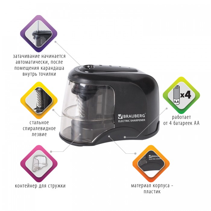 Точилка электрическая BRAUBERG "JET", питание от 4 батареек АА, спиралевидное лезвие, 228426