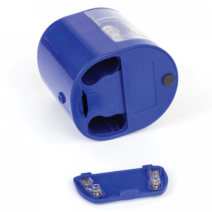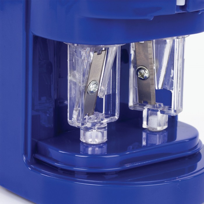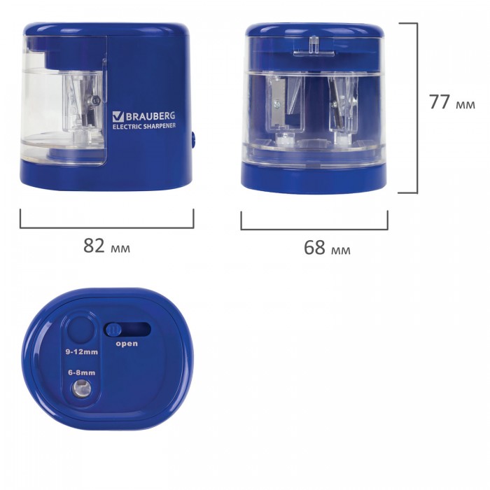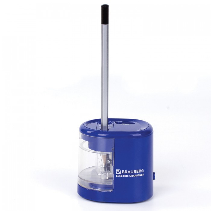 Электрическая точилка со съемным контейнером для сбора мусора и прямым лезвием, работает от 4 батареек АА (в комплект не входят). Имеет два отверстия для затачивания деревянных и пластиковых карандашей диаметром 6-8 мм и 9-12 мм.