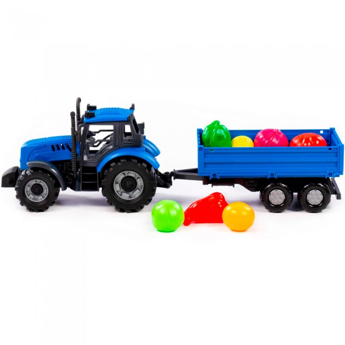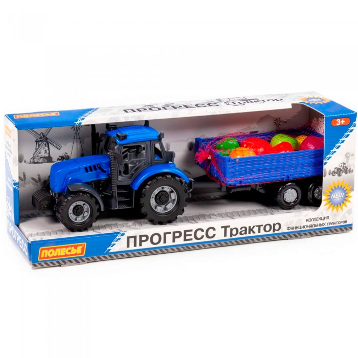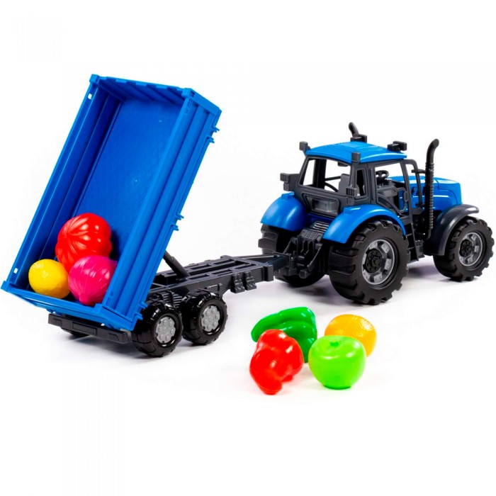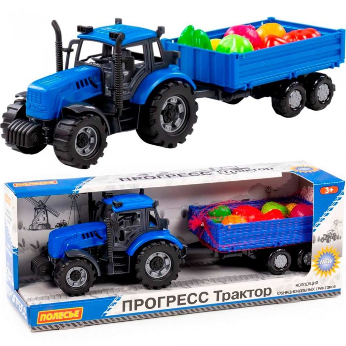 Трактор Прогресс с бортовым прицепом инерционный синий+набор продуктов 7 элементов 02291 П-Е /8/.