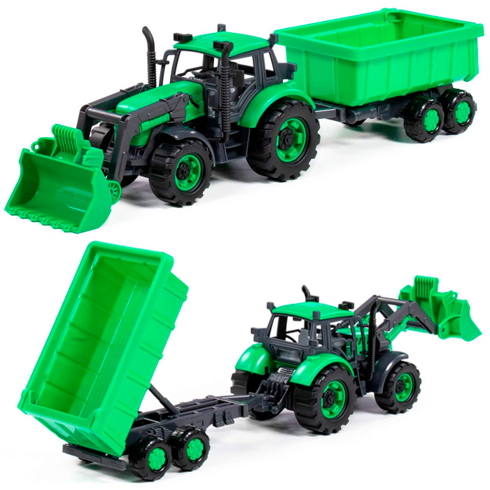 Трактор Прогресс с прицепом и ковшом инерционный зелёный в лотке 94667 П-Е