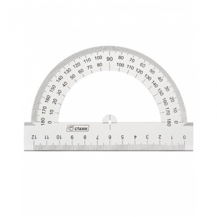 Транспортир СТАММ – незаменим для чертёжных и измерительных работ. Окружность изделия – 180°, длина – 12 см. Товар является прочным. Отверстие для карандаша позволяет точно находить центр и вычерчивать окружность. У транспортира ровная и чёткая миллиметровая шкала, безопасные закруглённые края и гладкая глянцевая поверхность. • Материал: полистирол; • Цвет: прозрачный.