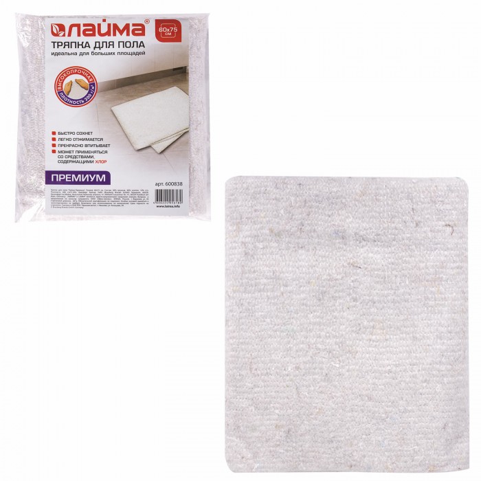 Тряпка для мытья пола 60х75 см, плотность 200 г/м2, 50% вискоза, 40% хлопок, 10% полиэстер, "Премиум" LAIMA, 600838