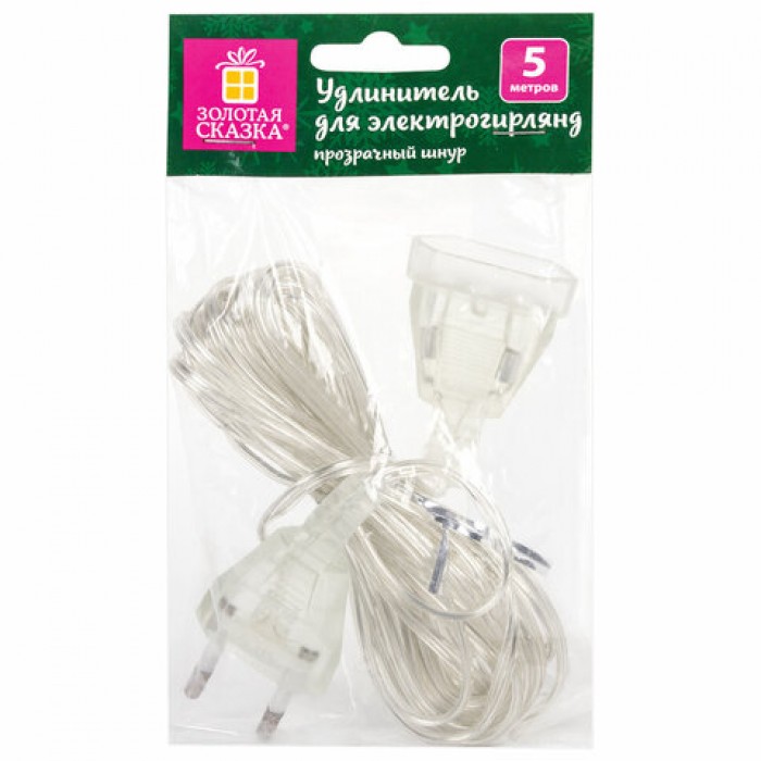 Удлинитель для электрогирлянд 5 м, прозрачный шнур, пакет, ЗОЛОТАЯ СКАЗКА, 591713