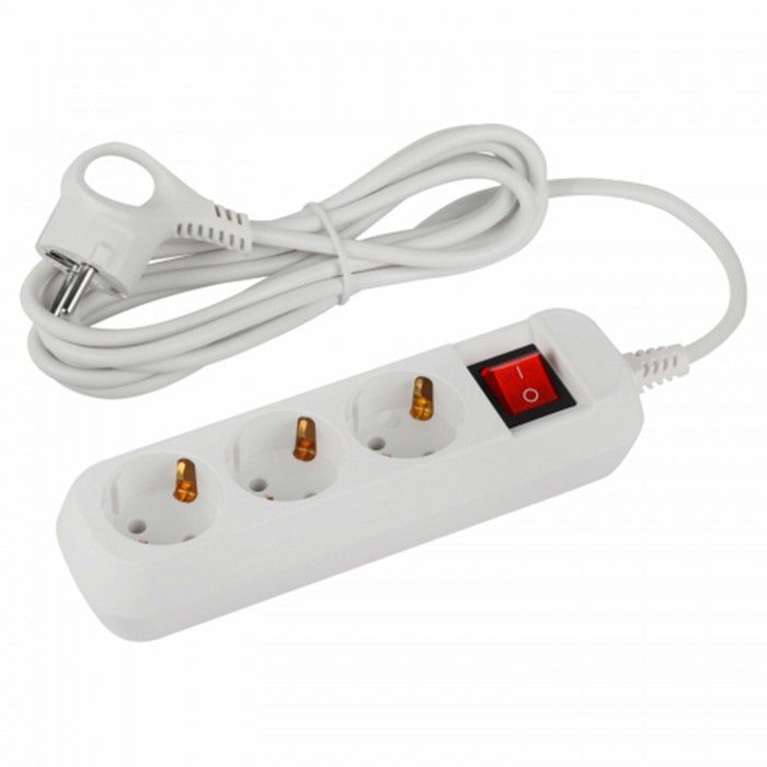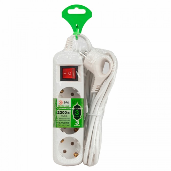 Удлинитель ЭРА UDL-10 Greenline, 3 розетки, с заземлением, с выключателем, 10 А, 3 м, белый, UDL-10-330-ES
