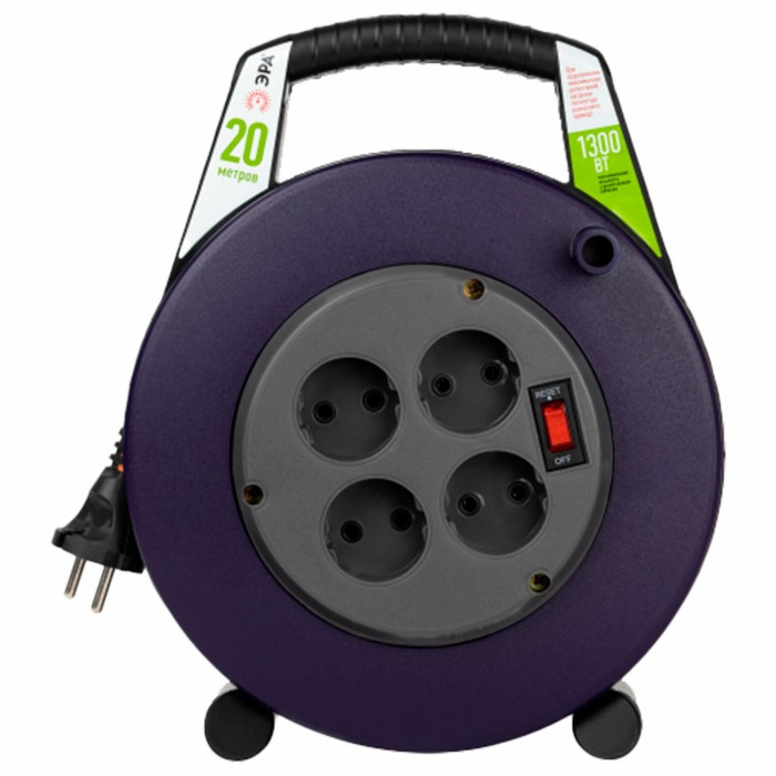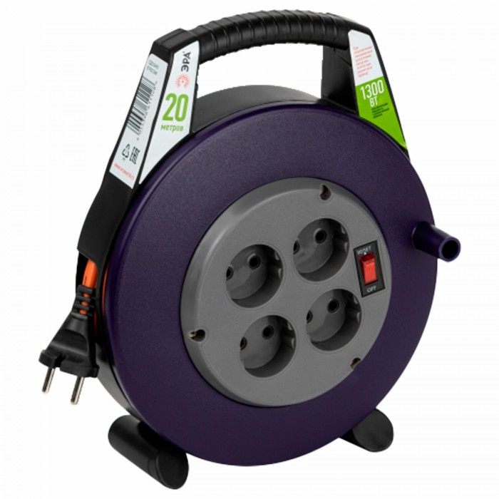 Удлинитель на катушке ЭРА BPx-4, 4 розетки без заземления, с выключателем, 20 м, 2x0,75 мм, 1300 Вт, 4-2x0,75-20m