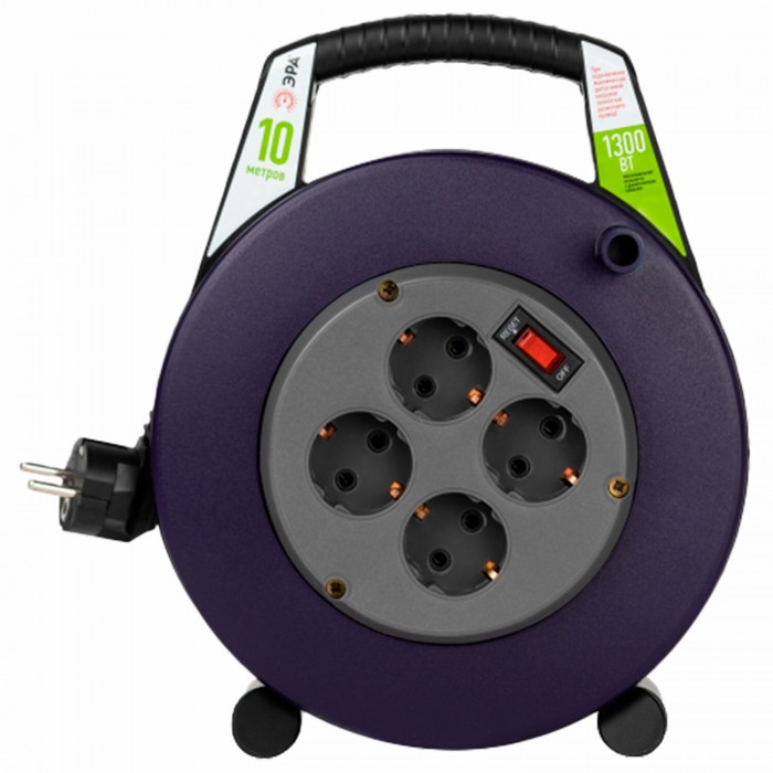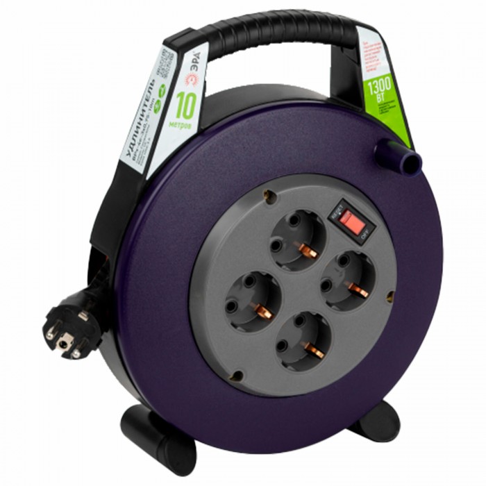 Удлинитель на катушке ЭРА BPx-4e, 4 розетки с заземлением, с выключателем, 10 м, 3x0,75 мм, 1300 Вт, 4e-3x0,75-10m
