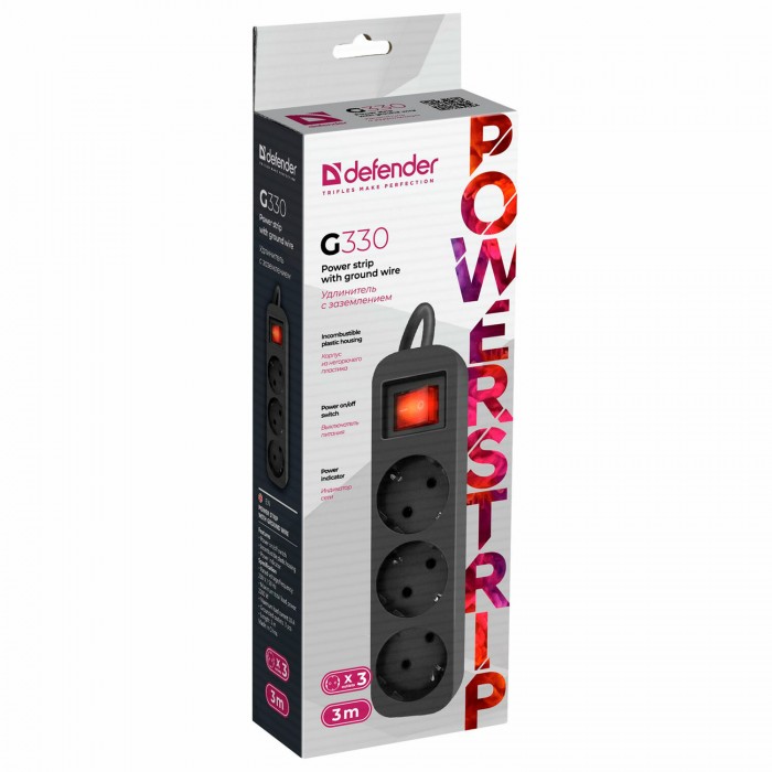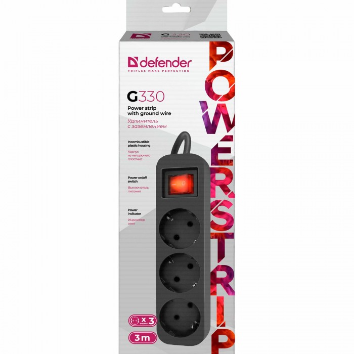 Удлинитель сетевой DEFENDER G330, 3 розетки, c заземлением, выключатель, 10А, длина 3 м, черный, 99334