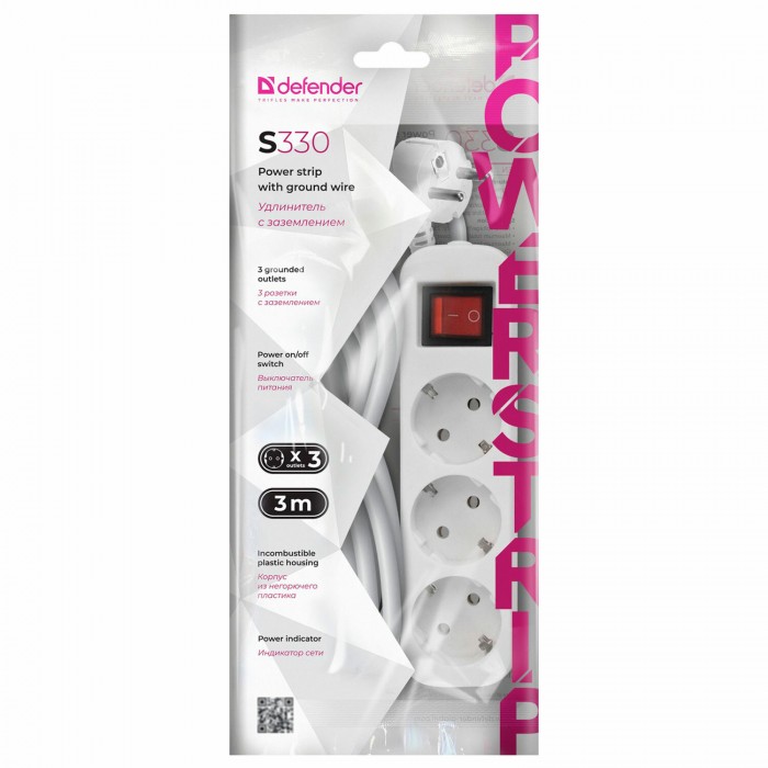 Удлинитель сетевой DEFENDER S330, 3 розетки, c заземлением, выключатель, 10А, длина 3 м, белый, 99234