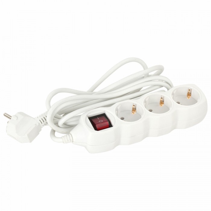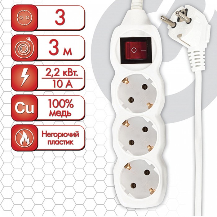Удлинитель сетевой SONNEN U-133GS, 3 розетки, c заземлением, выключатель, 10 А, 3 м, белый, 511434