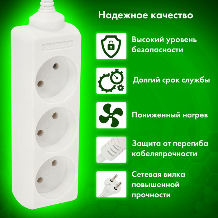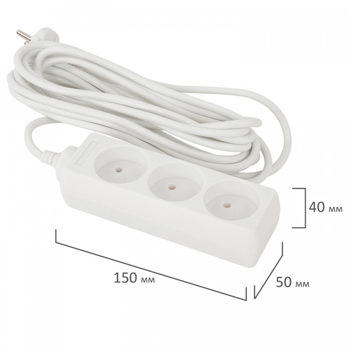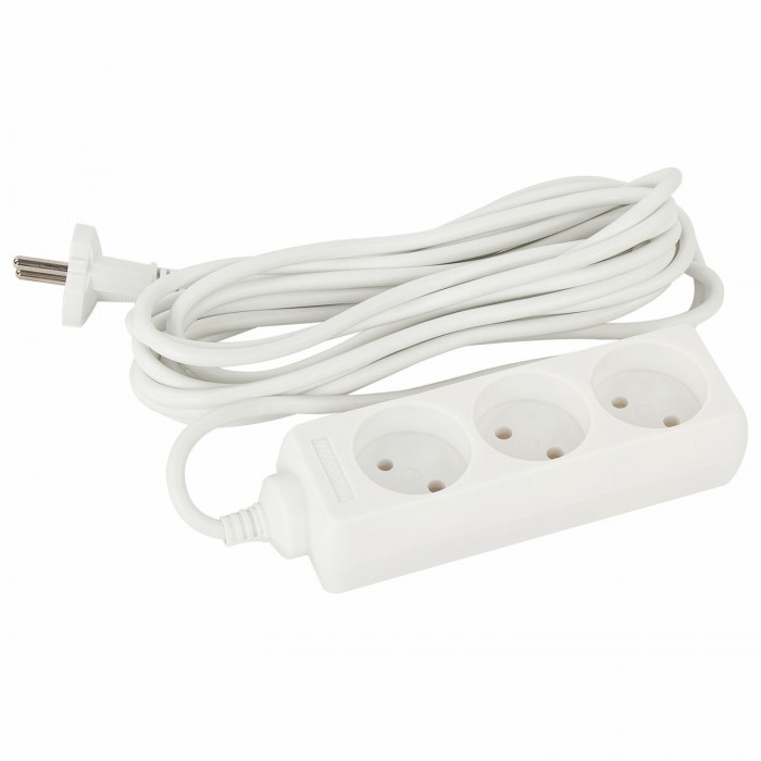 Удлинитель сетевой SONNEN U-135, 3 розетки, без заземления, 6 А, 5 м, белый, 511430