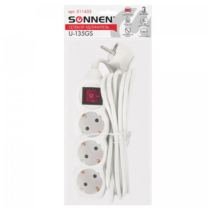 Высококачественный удлинитель SONNEN U-135GS предназначен для использования в офисе, в быту, на даче для подключения электроприборов различного назначения: осветительные приборы, бытовая техника, электроинструмент и т.д.