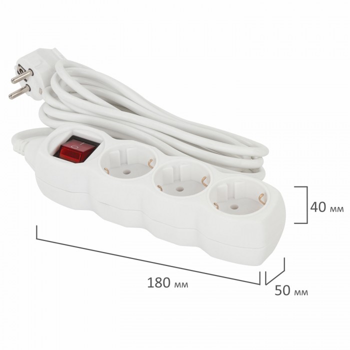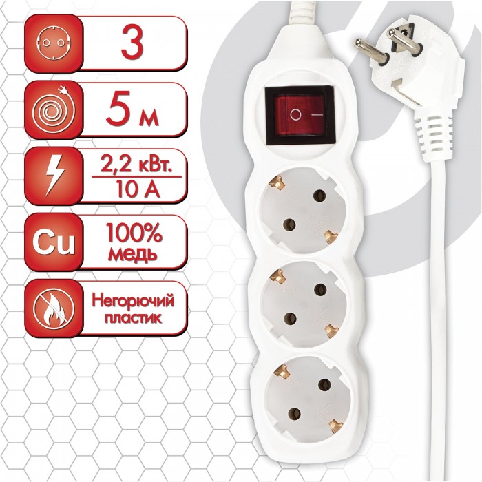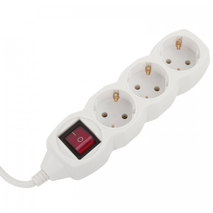 Удлинитель сетевой SONNEN U-135GS, 3 розетки, c заземлением, выключатель, 10 А, 5 м, белый, 511435