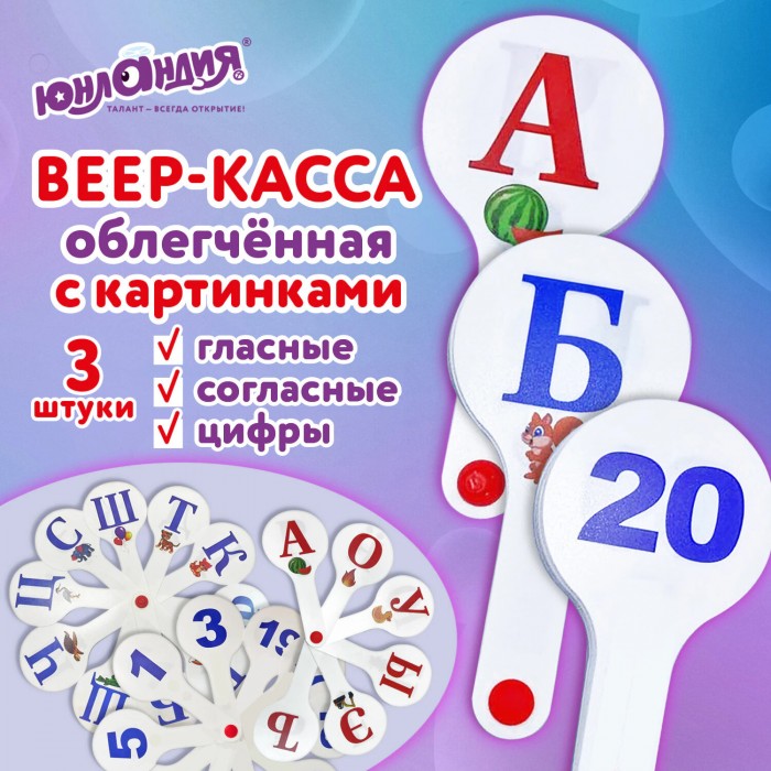 Веер-касса с картинками (гласные, согласные, цифры), ОБЛЕГЧЕННЫЕ, гибкие, НАБОР 3 шт., ЮНЛАНДИЯ, 274054 в интернет-магазине AV Group по цене от 336 руб. с доставкой по Верхней Пышме, Екатеринбургу и Свердловской области. Минимальная сумма заказа в корзине - от 10 т.р.