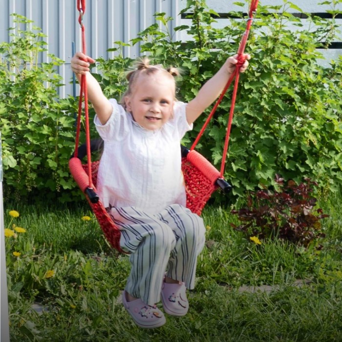 Яркий и необычный дизайн понравится как детям, так и взрослым: качели подходят для дачи, сада, загородного дома. Качественные, износостойкие материалы гарантируют долговечность эксплуатации. Крепкие шнуры устойчивы к стиранию и надежно фиксируют качели.