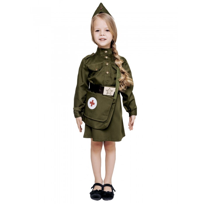 Костюм Военная Медсестра для девочек к праздникам 9 мая и 23 февраля представлен в широком ассортименте размеров от 4-х до 12 лет. В комплекте образа гимнастерка, юбка, пилотка, сумка и ремень.