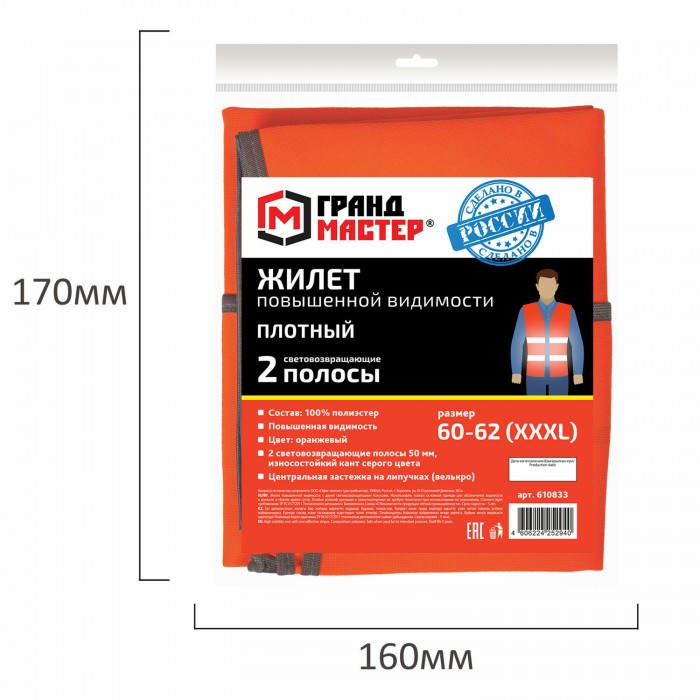 Жилет сигнальный ГОСТ, 2 светоотражающие полосы, ОРАНЖЕВЫЙ, XXXL (60-62), ПЛОТНЫЙ, ГРАНДМАСТЕР, 610833