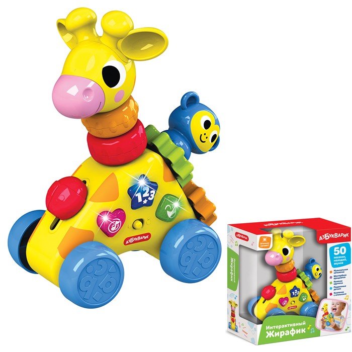 Размер упаковки: 22,1 х 24,1 х 10,2 см Вид упаковки: картонная коробка Размер товара: 14 х 19 х 8,8 см Страна производитель: КНР Материал: пластик Батарейки: 2ААА Возраст: 3+ «Интерактивный жирафик» придётся по душе маленьким непоседам. Нажимая на яркие кнопочки, малыш послушает обучающие песенки (про счет, формы, цвета и противоположности), детские хиты и веселые мелодии. Во время звучания песенок на кнопочках мигают огоньки. В процессе игры ребенок развивает мелкую моторику, координацию движений, цветовосприятие и логическое мышление. Особенности: - необычный, стильный дизайн; - познавательные песенки; - цветные кнопочки; - подвижные детали; - изготовлена из качественного, нетоксичного пластика.