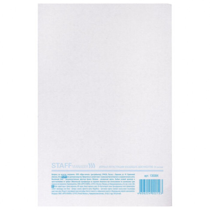 Журнал регистрации входящих документов, 48 л., картон, блок офсет, А4 (200х290 мм), STAFF, 130084